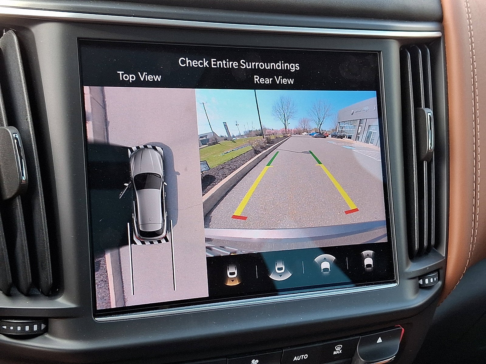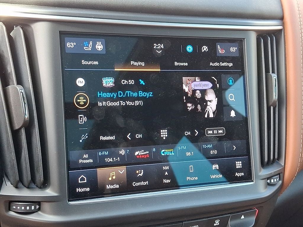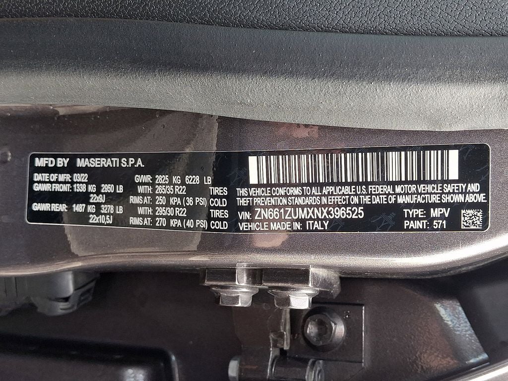 It features 12-Way Heated Power Sport Front Seats, 14 Speakers, 4-Wheel Disc Brakes, ABS brakes, Active Cruise Control, Adaptive suspension, Air Conditioning, Alcantara Headliner & Pillars, AM/FM radio: SiriusXM, Anti-whiplash front head restraints, Apple CarPlay/Android Auto, Auto High-beam Headlights, Auto-leveling suspension, Automatic temperature control, Bowers & Wilkins 1280W Ultra Premium Audio System, Brake assist, Comfort & Convenience Package, Dual front impact airbags, Dual front side impact airbags, Electronic Stability Control, Emergency communication system: Maserati Connect, Exterior Parking Camera Rear, Four wheel independent suspension, Front anti-roll bar, Front dual zone A/C, Full Premium Perforated Leather Upholstery, Garage door transmitter: HomeLink, Gloss Yellow Painted Brake Calipers, Heated door mirrors, Heated Rear Seats, Heated steering wheel, Heated Windshield Washer Nozzles, High Gloss Ebano Wood Trim, Illuminated entry, Leather Shift Knob, Leather steering wheel, Low tire pressure warning, Memory seat, Navigation System, Occupant sensing airbag, Outside temperature display, Overhead airbag, Overhead console, Passenger vanity mirror, Pieno Fiore Natural Leather Upholstery, Power door mirrors, Power driver seat, Power Liftgate, Power moonroof, Power steering, Power windows, Power-Adjustable Foot Pedals, Radio data system, Radio: AM/FM w/Maserati Intelligent Assistant, Rain sensing wipers, Rear anti-roll bar, Rear reading lights, Rear seat center armrest, Rear window defroster, Remote keyless entry, Security system, Soft-Close Doors, Speed control, Speed-sensing steering, Sport steering wheel, Steering wheel memory, Steering wheel mounted audio controls, Tachometer, Telescoping steering wheel, Tilt steering wheel, Traction control, Trident Logo Stitched on Front & Rear Headrests, Trip computer, Turn signal indicator mirrors, Upgraded Full Leather Upholstery, Ventilated Front Seats, Voltmeter, and Wheels: 22 Painted Staggered Orione Miron.