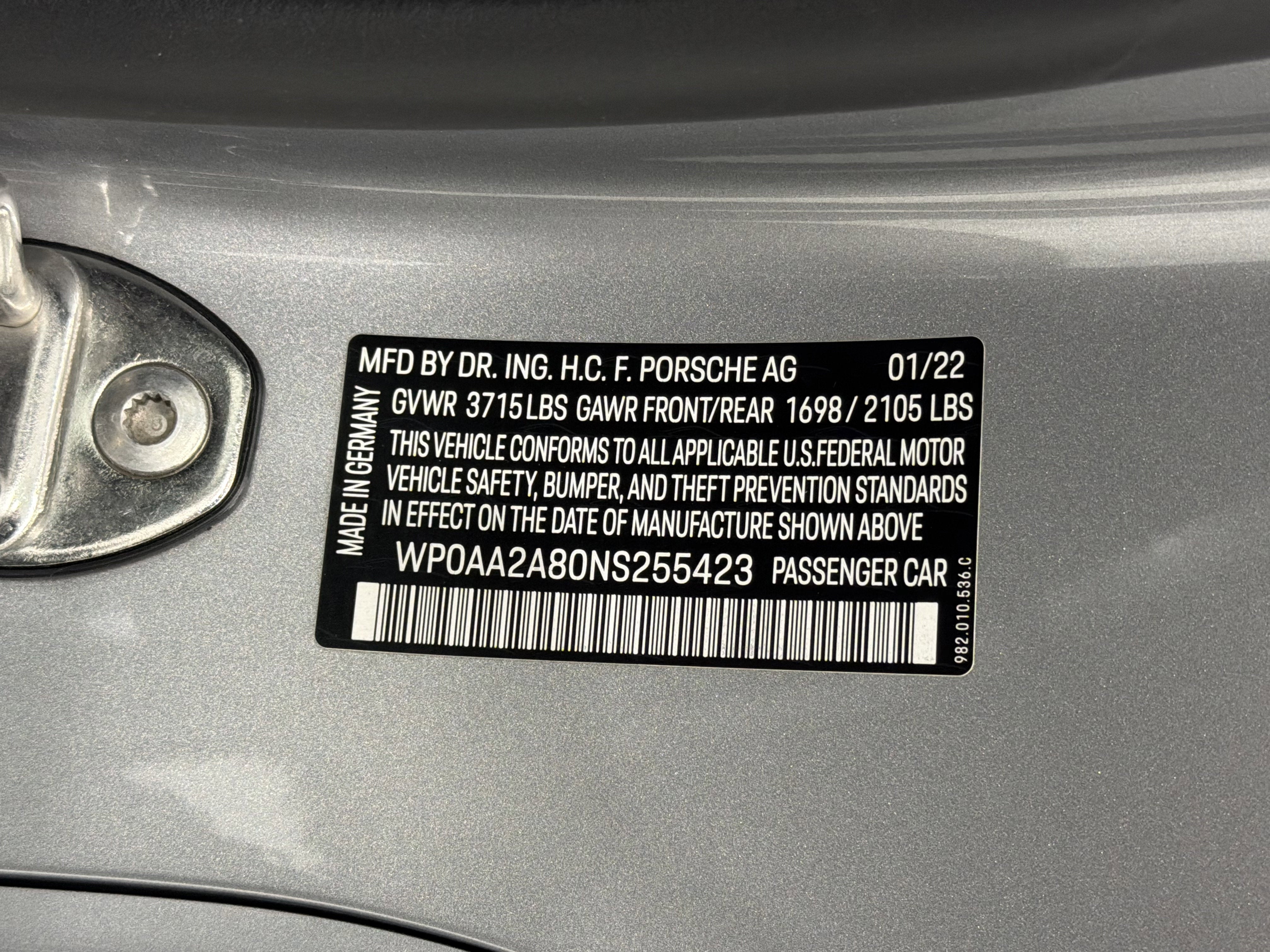 CPO - Certified Pre-Owned 2022 Porsche 718 Cayman with PDK with great options in a classic Porsche color combination and great options.2022 Porsche 718 Cayman (MY22) $60,500AG Standard Interior in BlackU2 GT-Silver Metallic $650P9F Premium Package $4,050489 Heated Multifunction Steering Wheel541 Ventilated Seats581 Luggage Net in Passenger Footwell9VL BOSE Surround Sound-System602 LED Headlights incl. Porsche Dynamic Light System Plus (PDLS+)630 Light Design Package748 Power Folding Exterior Mirrors457 Lane Change Assist (LCA)625 Porsche Entry & DriveXAN SportDesign Package in High Gloss Black $3,600718 Model Designation Logo on Rear Changed to 718250 7-speed Porsche Doppelkupplung (PDK) $3,210XLW Sport Tailpipes in Black $660085 Extended Range Fuel Tank, 16.9 gal $140XDK Wheels Painted in Satin Black $1,290433 20 Carrera S Wheels $2,730Total Retail Vehicle Price: $76,830Delivery, Processing and Handling Fee: $1,350Total of Charges & Taxes: $1,350Total Retail Price*: $78,18021/27 City/Highway MPG Clean CARFAX. 2022 Porsche 718 Cayman Base SilverPorsche Delaware is the newest member of the Piazza Auto Group. Our focus is to provide the highest quality service to create lifetime customer. We are committed to long-term growth which can only happen with your complete satisfaction.